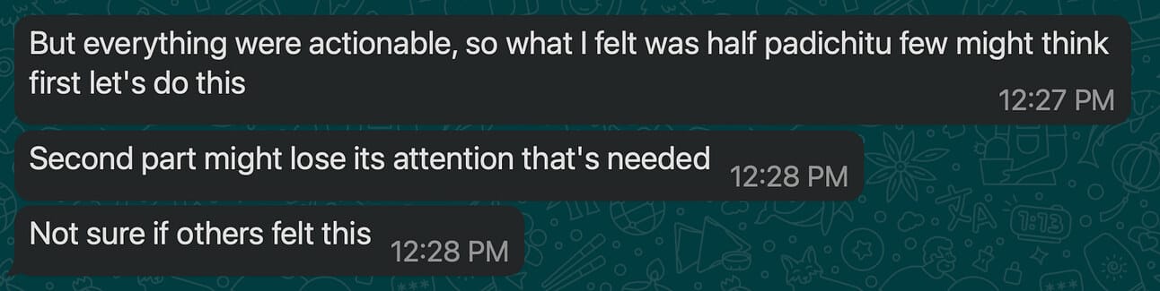 Correct thaan. Some people tend to take quick actions and might miss coming back for the second half. Another one was…